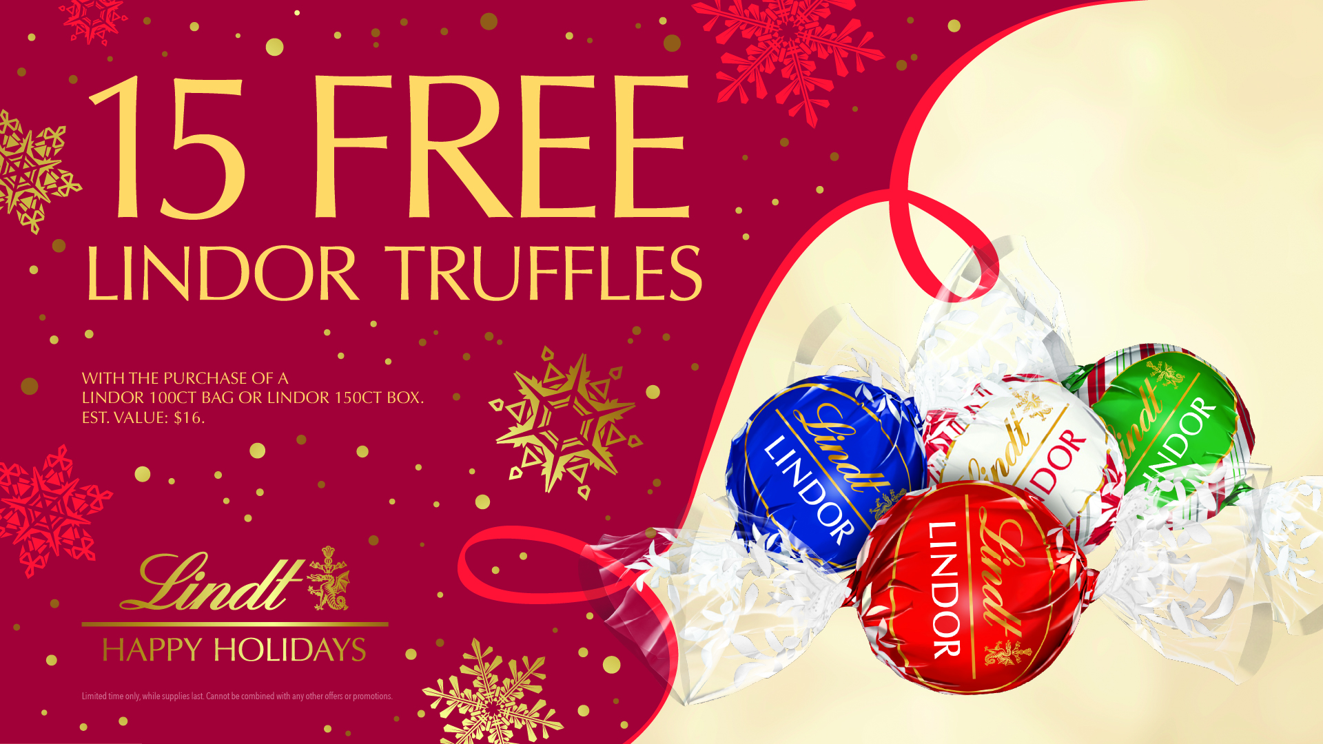 From now until November 16th, get 15 FREE Lindor Truffles with a purchase of a Lindor 100ct bag or Lindor 150ct box!