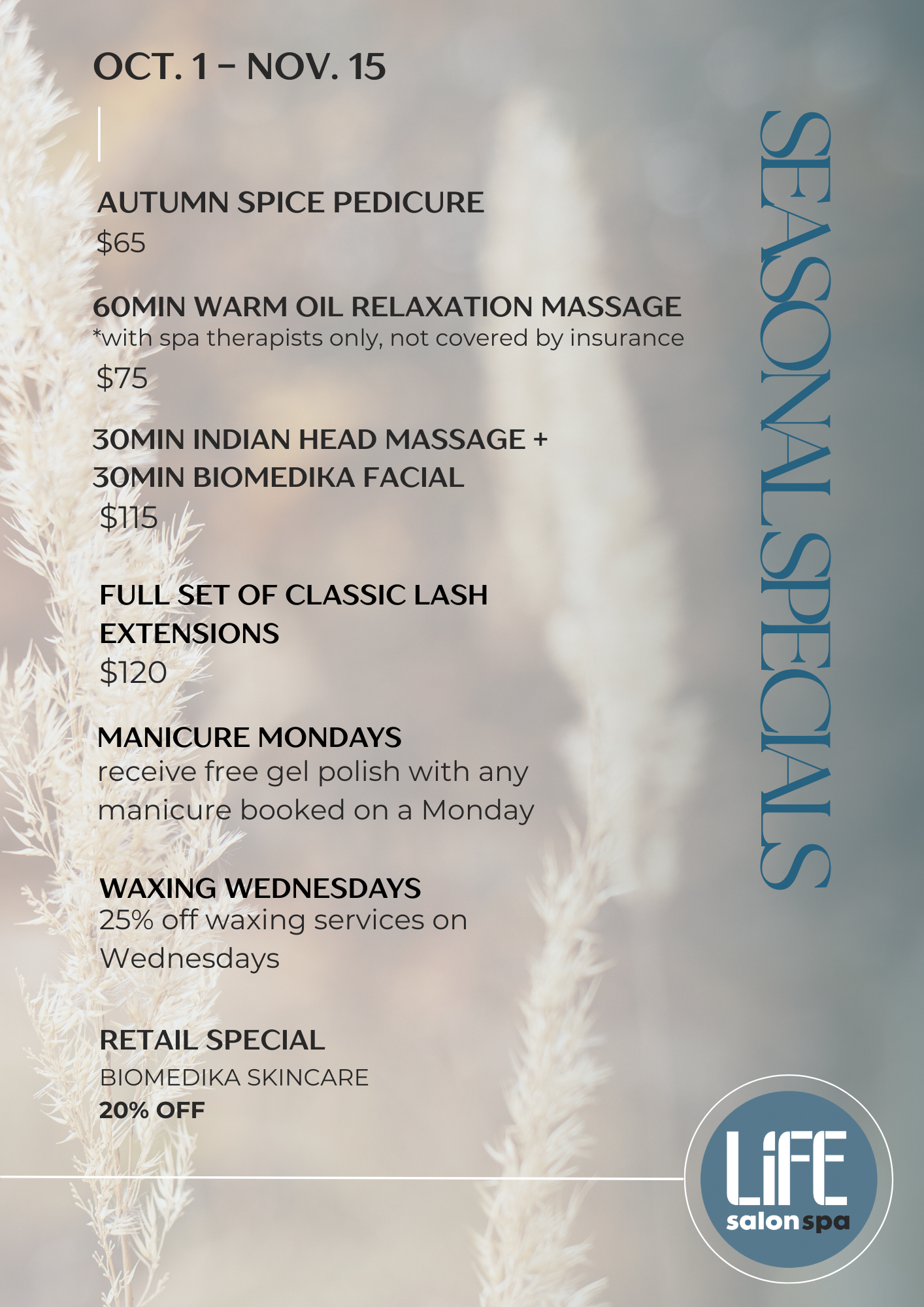 Find the latest seasonal specials at Life SalonSpa from now until November 15!